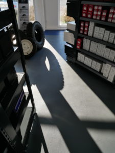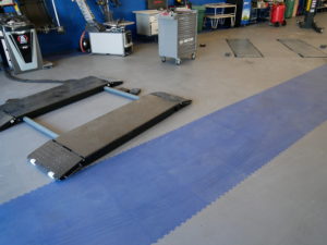 On retrouve la même gamme dans l’espace dédié à la clientèle. Dans le prolongement de la zone mécanique, il était préférable de créer une uniformité. Les dalles Module Garage permettent de réduire le bruit ambiant émanent de la partie atelier. De plus, elles offrent un confort de marche inégalable aux clients et isole du froid ainsi que de l’humidité.