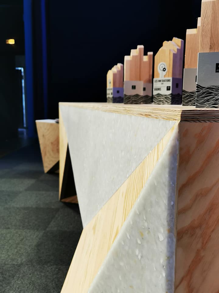 Les pupitres ont été confectionnés avec du bois issu du recyclage ainsi que des plaques de plastique recyclé Good Plastic en coloris Salt Dune #PS172. Un décor aux allures de pierre naturelle et au toucher lisse et soyeux. C’est un matériau en polystyrène 100% recyclé. Originellement, il provenait de bobines utilisées dans des domaines industriels.