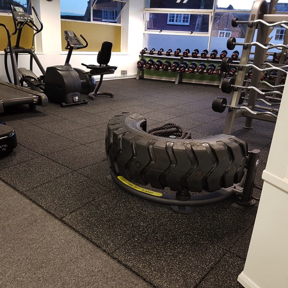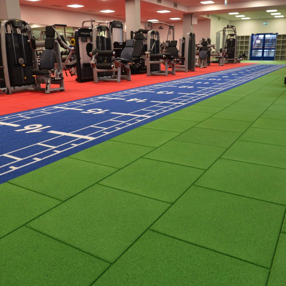 Les dalles incorporent un haut pourcentage de caoutchouc recyclé issu de la revalorisation des pneus usagés. Cette matière demeure très robuste, souple et flexible, autant d’atouts qui en font un matériau adapté aux problématiques d’une salle de sport. Ce revêtement est donc très résistant aux chocs et sécurise la zone sportive. En effet, sa forte densité évite un éventuel rebond d’objets lourds comme des poids.