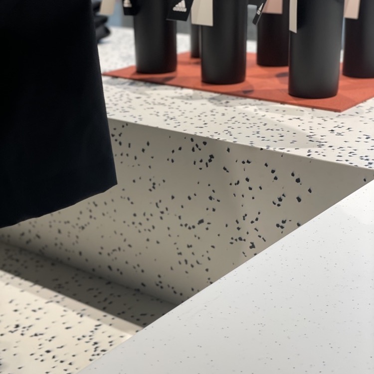 Notre matériau de surface peut avoir nombre d’applications. Étant innovant et élégant, il capte l’attention, ce qui en fait un très bon choix pour la création d’une enseigne. En entrant dans le complexe d’escalade Atome, vous trouverez, face à vous, le logo réalisé en Polygood. Il a été créé en décor Sapphire Terrazzo.