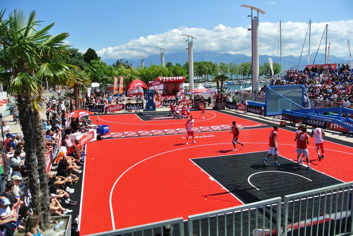| Rénovation du terrain multisport extérieur de la commune de Papeete à Tahiti. | Rénovation du complexe sportif d’un collège avec les dalles Patmos-Master. | Structure temporaire pour un événement de basketball en Suisse. |