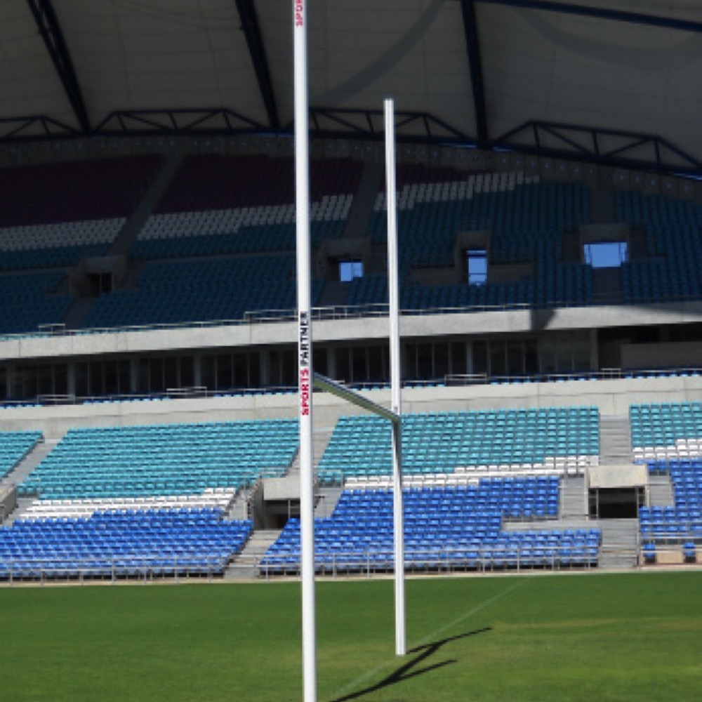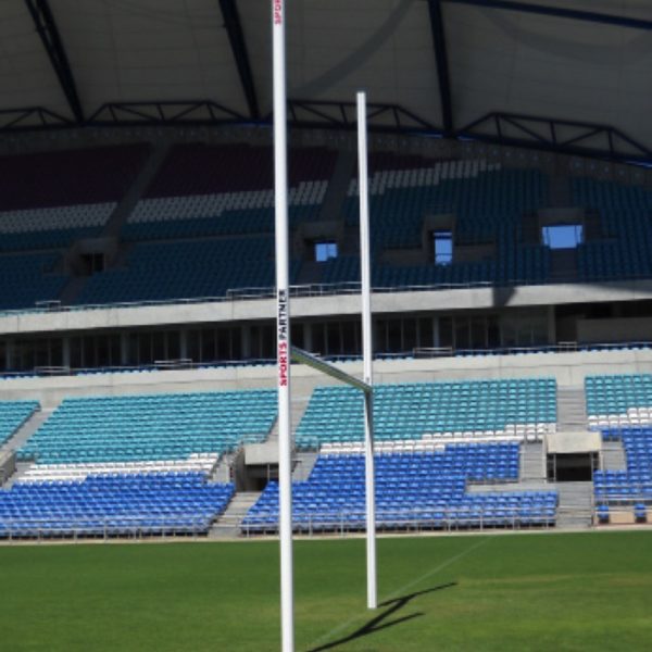 But de rugby, fabriqué en profil aluminium arrondi de 120mm laqué en blanc. Fixé au sol à travers des manchons dessinés pour ce but. (RUGB0008)